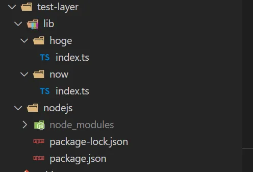 lib 配下に自作モジュールを置き、nodejs 配下には layer の中で使用する package が含まれています。