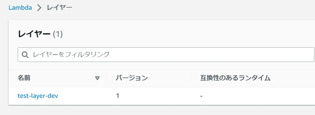 今回自分が作成したレイヤーは「test-layer」という名前なので、「TestLayerLambdaLayer」という名前になる・・・かと思ったらこれではなかったようです。