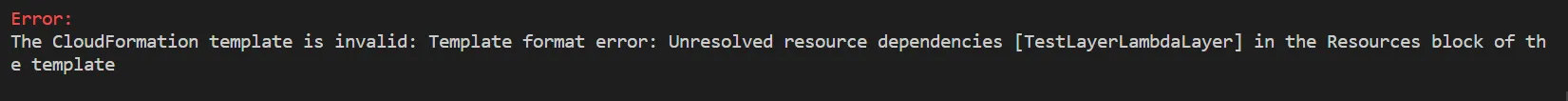 The CloudFormation template is invalid: Template format error: Unresolved resource dependencies [TestLayerLambdaLayer] in the Resources block of the template